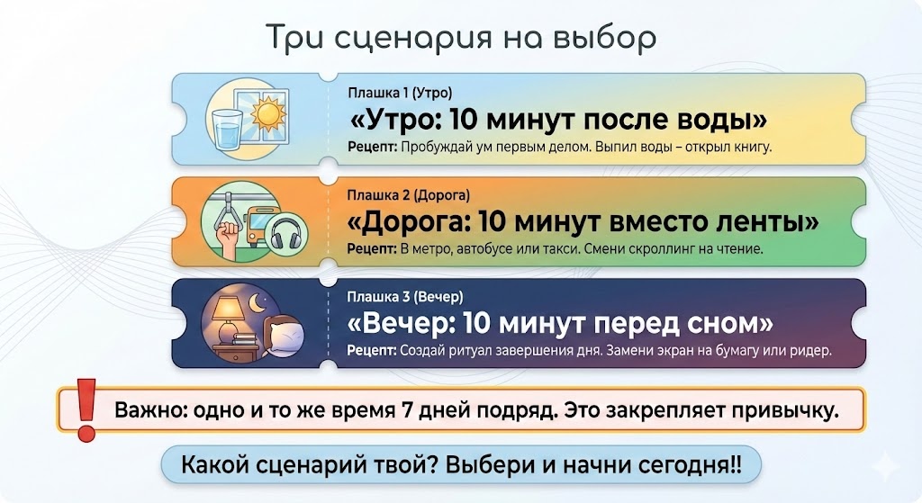Как перестать бояться букв Представим ри сценария, три попытки обмануть собственную лень и доказать алгоритмам социальных сетей, что мы еще способны фокусировать взгляд на чем-то, что не светится синим пламенем. Утренняя пытка влагой и смыслом Первый сценарий предлагает нам пробуждать ум сразу после воды. Десять минут чтения утром. Это звучит как издевательство над естественным правом человека ненавидеть весь мир первые полчаса после пробуждения. Вы когда-нибудь пробовали читать Достоевского, когда ваш желудок еще не свободен, а мозг отчаянно требует кофеина? Это своего рода когнитивный детокс. Вода промывает почки, книга — остатки вчерашнего информационного шума. В этом есть определенный парадокс: мы пытаемся загрузить в себя чужие мысли еще до того, как успели сформулировать свои собственные претензии к этому дню. Но, признаемся честно, это лучше, чем первым делом проверять рабочую почту или смотреть, кто из знакомых снова съел что-то невероятно фотогеничное в отпуске. Троллейбус как