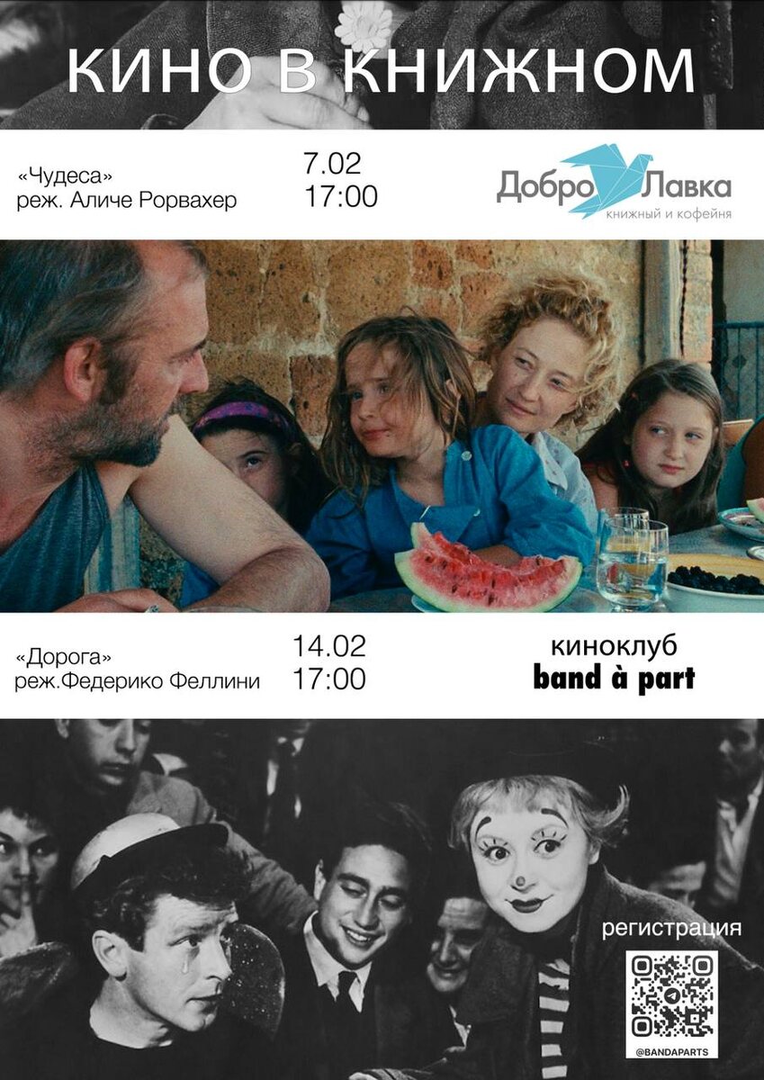 : 🎬 киноклуб в книжном — в эту субботу 7 февраля в 17:00 у нас пройдет первый кинопоказ с обсуждением, а самое главное — эти встречи теперь будут регулярными! Начнем с итальянского кино (кажется, что это лучший вариант, что может согреть нас этими морозными вечерами). 7 февраля в 17:00 посмотрим фильм Аличе Рорвахера «Чудеса» (2014) — современного, живого, очень телесного кино о семье, взрослении и хрупком равновесии между реальностью и мифом. А 14 февраля тоже в 17:00 посмотрим фильм Федерико Феллини и его «Дорогу» (1954) — фильму-путешествие, где дорога становится судьбой, а простота — формой глубины. Запись и подробности в посте киноклуба. 📖 В феврале мы продолжим читать и обсуждать скрытый смысл страшных сказок. Тема встреч февраля — страшные русские сказки. После серии встреч и обсуждения мрачных сказок Братьев Гримм мы узнали, что все истории тесно связаны, сюжеты сказок разных стран пересекаются. Но наши, родные, ведь самые близкие нам, да?) Кошей Бессмертный, Лихо одноглазо