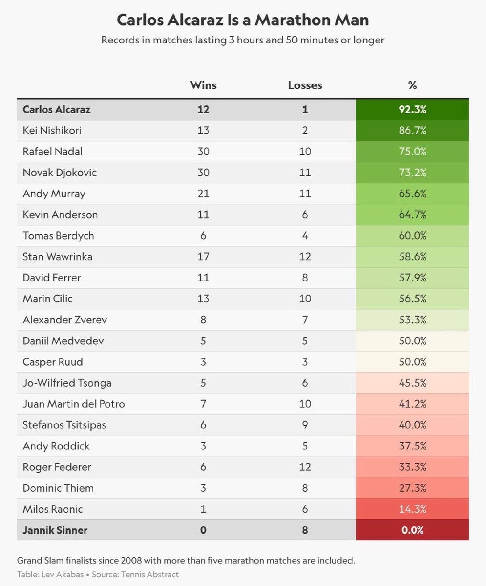 💪 Теннисисты с лучшей статистикой в матчах, длящихся 3 часа 50 минут и дольше: Карлос Алькарас 12-1 Кей Нисикори 13-2 Рафаэль Надаль 30-10 Новак Джокович 30-11 Энди Маррей 2-1 Кевин Андерсон 11-6 Томаш Бердых 6-4 Стэн Вавринка 7-12 Давид Феррер 8-8 Марин Чилич 13-10 Александр Зверев 8-7 Даниил Медведев 5-5 Каспер Рууд 5-5 Жо-Вильфрид Тсонга 5-6 Хуан Мартин дель Потро 7-10 Стефанос Циципас 6-9 Энди Роддик 1-5 Роджер Федерер 6-42 Доминик Тим 3-8 Милош Раонич 1-6 Янник Синнер 0-8 Подпишись на Эйс и точка