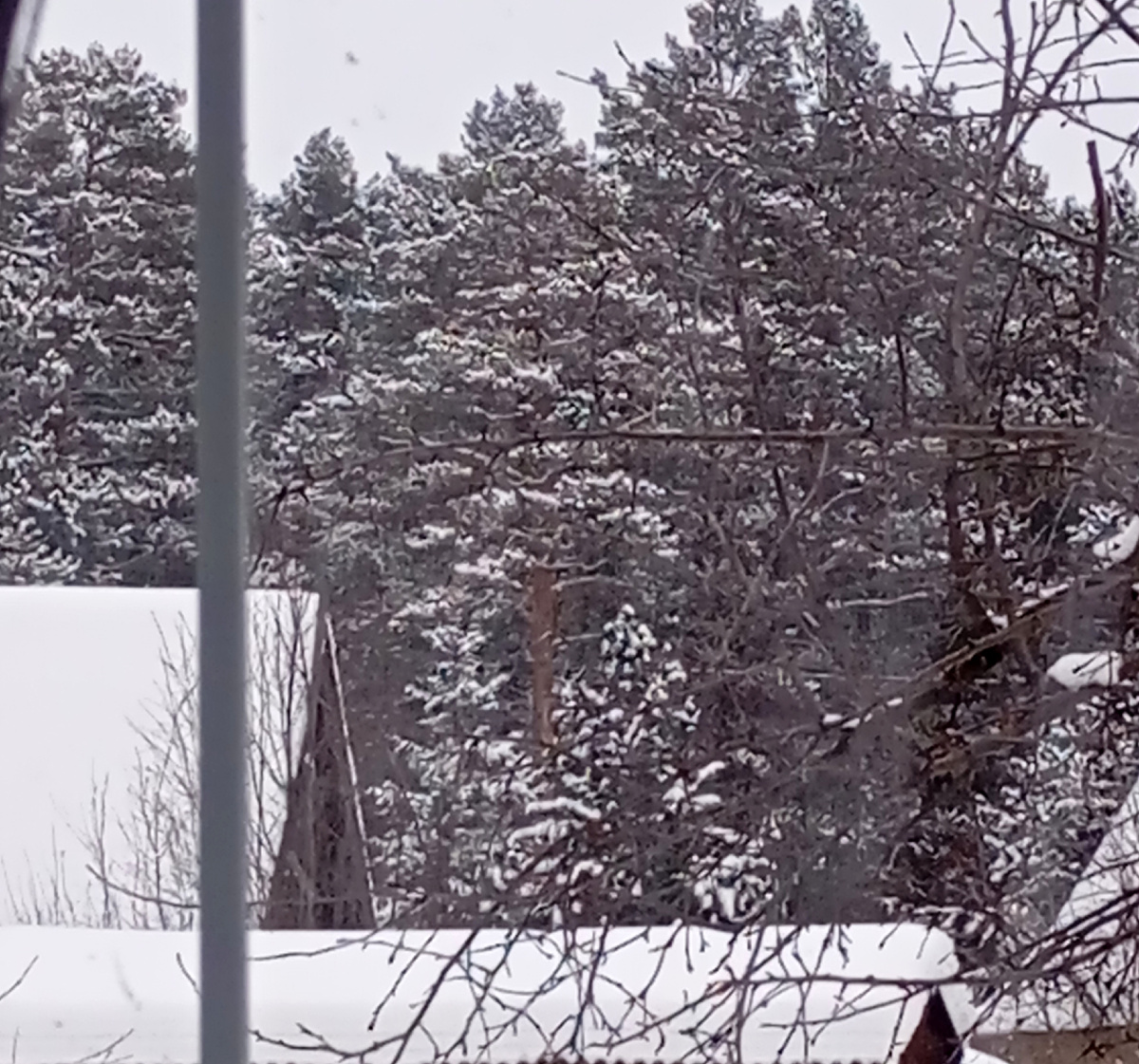 С утра уже падает крупными хлопьями снег.Сосны шикарные за окном..
