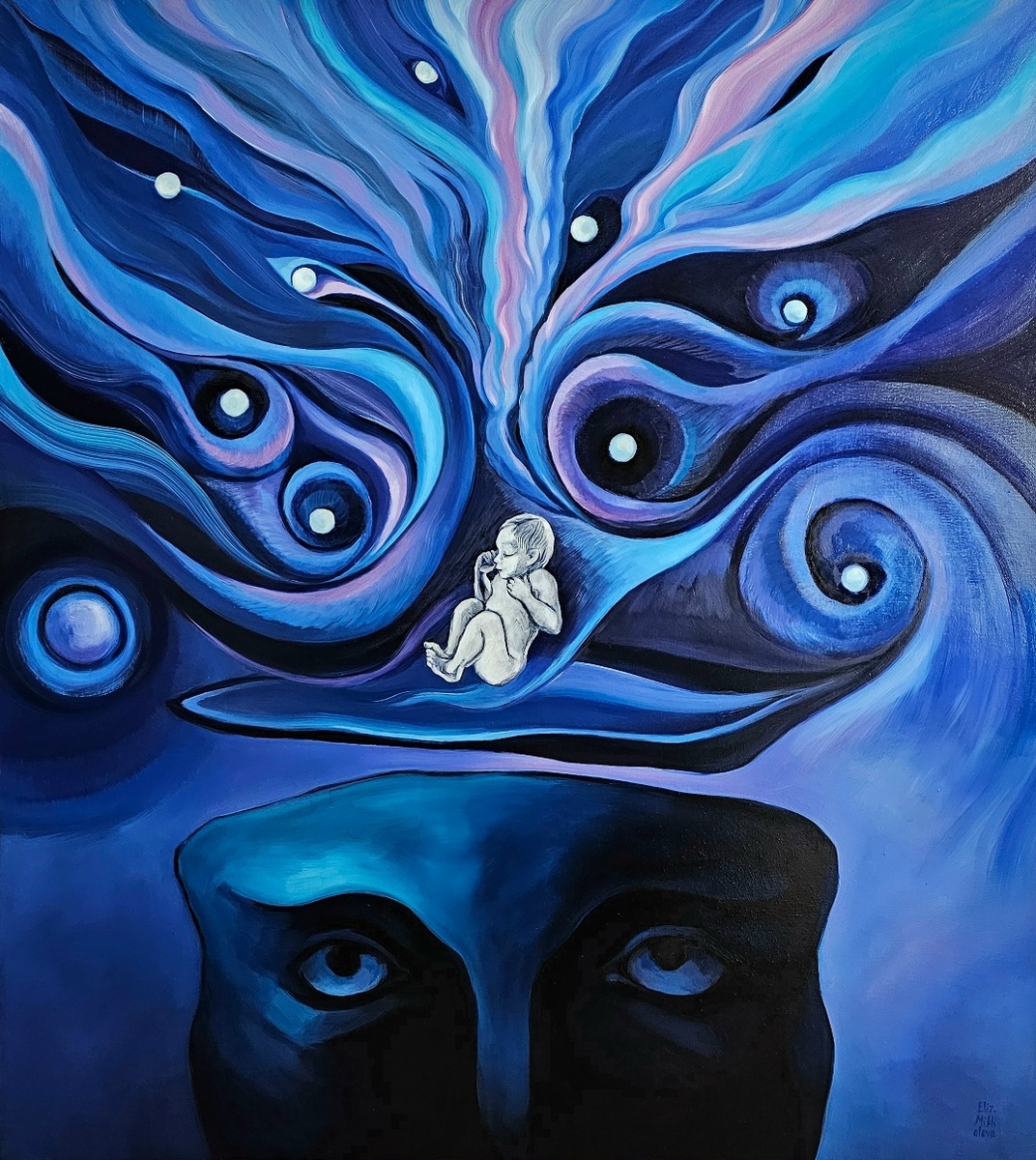 2025 год был для меня настолько плодотворным, что я смогла представить зрителю две персональные выставка и на каждой показать новые работы. Первая выставка прошла весной, а вторую я открыла в канун своего дня рождения 13 декабря 2025 года. Получилась очень искренняя выставка о внутренних лабиринтах души, чувстве границ, поиске любви, хрупкости связей с внешним миром и недосягаемости горизонта. Выставки, которые проходят на территории художника, всегда личные, без внешних фильтров, поэтому я люблю этот формат. На них можно увидеть то, что вам не покажут ни в одной галерее. Главной работой выставки стала картина «В предчувствии своего рождения», которую я создавала несколько лет и завершила именно для этого события. Картину обязательно нужно увидеть вживую — её масштаб, глубина цвета и фактура красочного слоя дают в полной мере ощутить всю силу этого произведения и, возможно, вспомнить, какое оно — предчувствие своего рождения. Основу выставки составила серия работ «Жизнь страшна и чудес