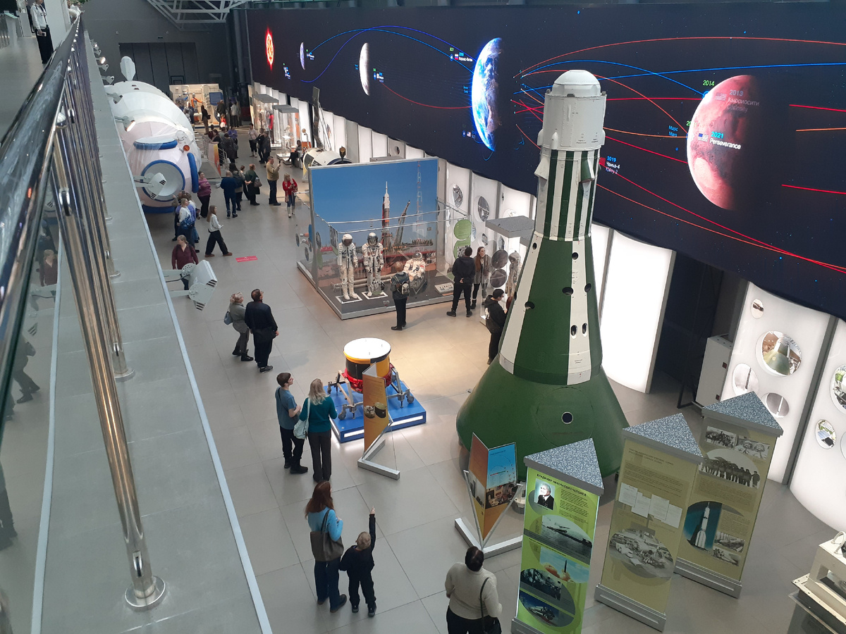Зеленый многоразовый возвращаемый аппарат ВА. Разные скафандры. Вид на Землю. Макет базового модуля орбитальной станции «Мир» в натуральную величину. Внутри. Космическая еда. Тренажеры. Душевая кабина. Как надеть скафандр? Вернее, влезть в него? Подлинный спускаемый аппарат космического корабля «СОЮЗ-34». Видно, что подлинный, не макет. Идем в кафе. Меню. Подкрепились и идем в 1 (старый) корпус.