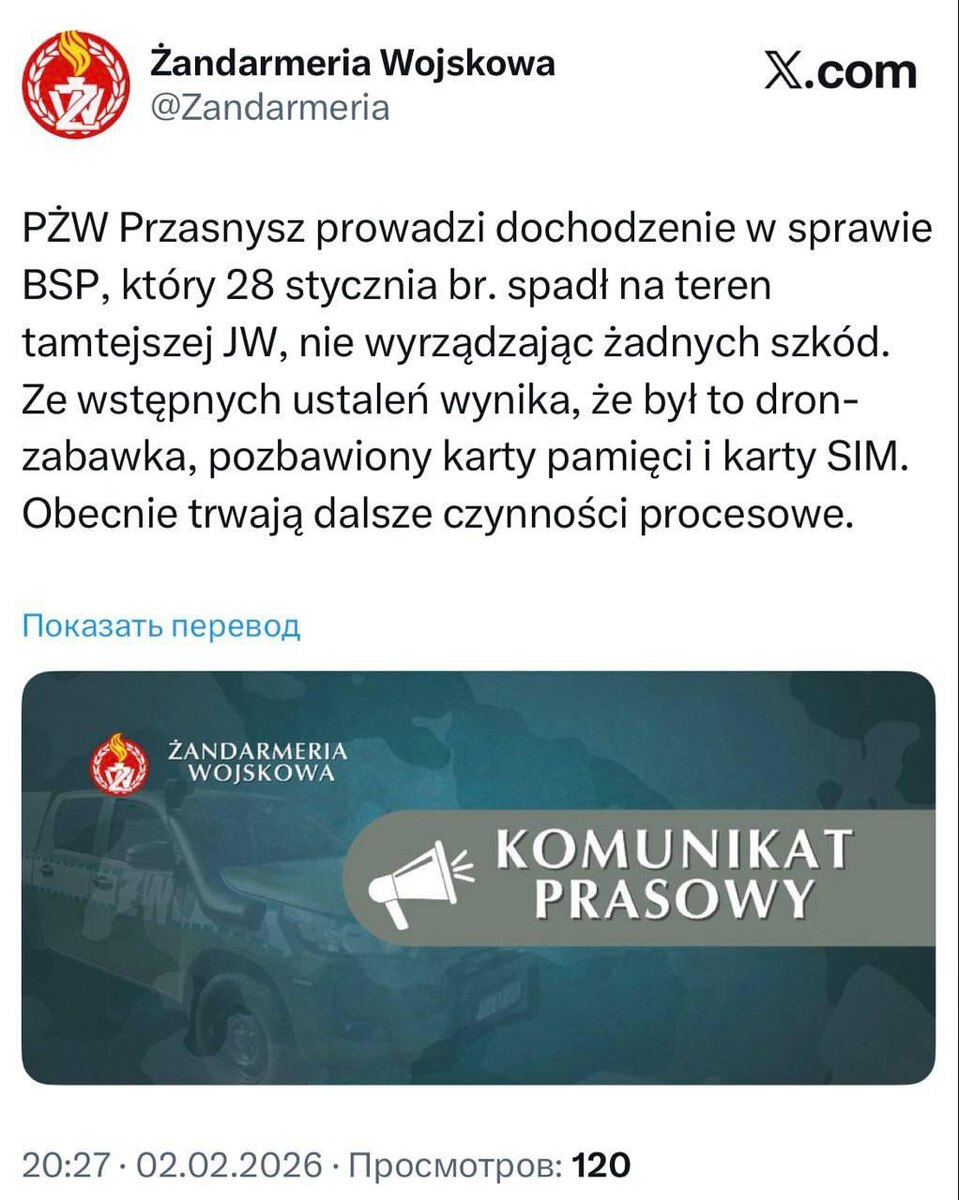 БПЛА обнаружен примерно в 70 м от склада оружия в городе Пшасныш, примерно в 100 км к северу от Варшавы. Факт инцидента официально подтвердила военная жандармерия Польши, которая теперь задним числом ведет расследование. По предварительной информации источников Radio ZET, беспилотник был разведывательным. Дежурные военной базы "наблюдали за его полетом и ничего не могли сделать", сказал собеседник радиостанции. "После падения дрона военнослужащие осмотрели его и занесли в здание базы. Хотя, согласно процедуре, "его следовало накрыть сеткой или брезентом и не перемещать",- отметил источник Radio ZET. 🔴 Читайте Sputnik Беларусь в MAX