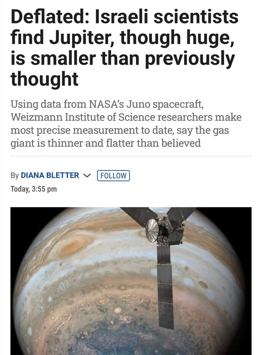 Рубрика: Технологии Юпитер — не такой уж и гигант, как мы думали. 🪐 Учёные из Института Вейцмана с помощью зонда NASA Juno выяснили, что экваториальный радиус планеты составляет 71 484 км, а полярный — 66 842 км. Это на 412 км меньше предыдущих оценок. Результаты исследования, опубликованные в Nature Astronomy, подтверждают: Юпитер немного «сжался». И это не просто цифры — это пересмотр наших представлений о крупнейшей планете Солнечной системы. Что это значит для науки? Возможно, придётся пересмотреть модели формирования планет и их эволюции. А пока Юпитер продолжает удивлять нас своими тайнами. 🌌 Источник: The Times of Israel #Юпитер #NASA #Juno #Институт_Вейцмана #космос Читать на сайте ➡️ Подписаться