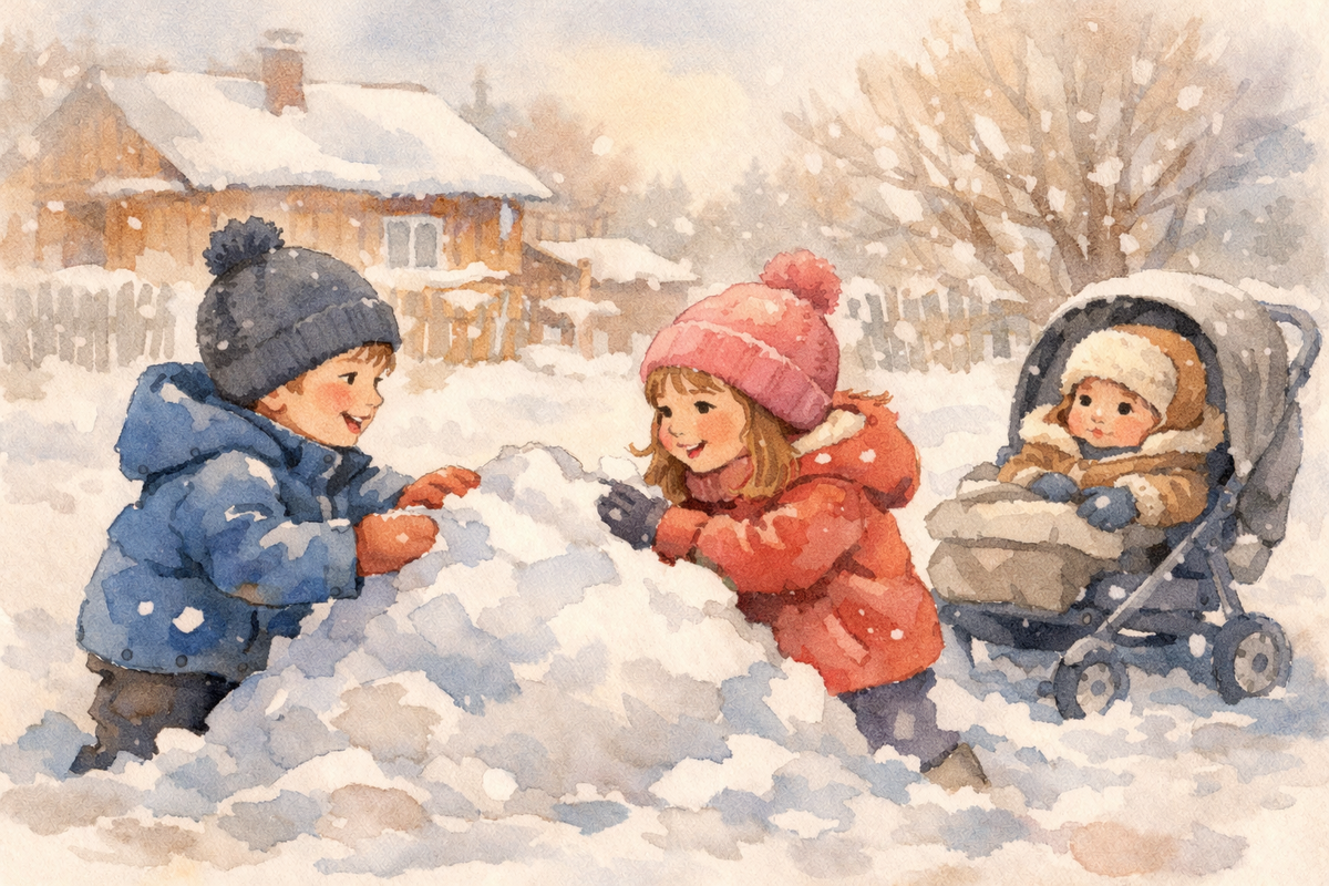 — Не-е-ет, я первый! — возмутился Никита. Они клали снег одновременно. Сугроб получался кривой, но довольный.