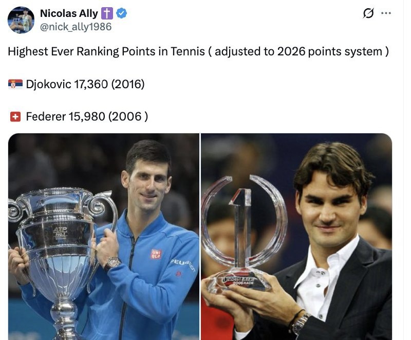 🎾 А вы знали, что рекорд по очкам в теннисе принадлежит Novak Djokovic - 17,360 (в 2016)? 🏆 Второй - Federer с 15,980 очками (2006) 🔥 Nicolas Ally @nick_ally1986 отмечает, что это adjusted to 2026 points system. Подпишись на Эйс и точка