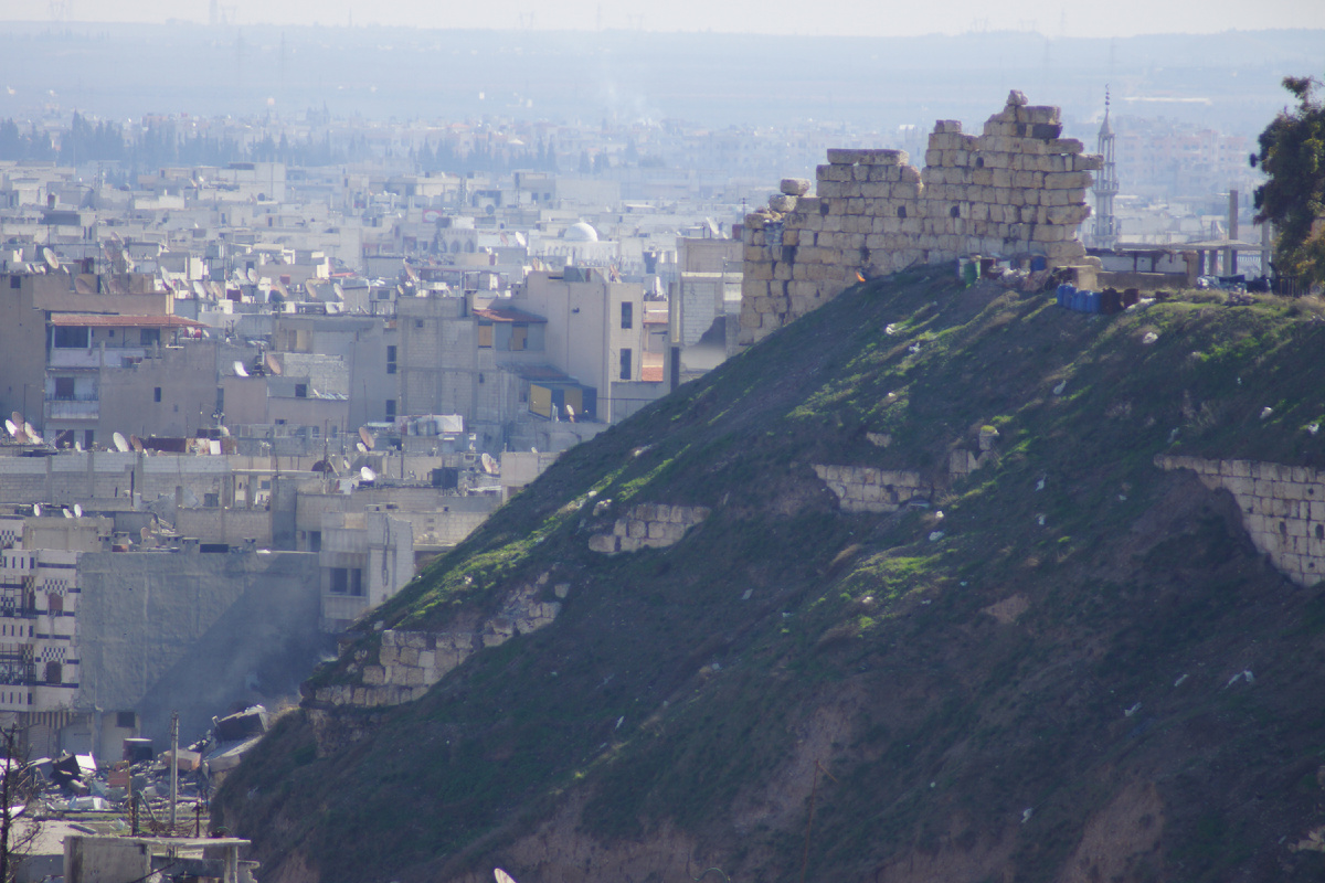 Это оказались остатки крепости города Хомса. Да, есть и такая. И она вообще не раскопана, судя по всему. В сети никаких фото раскопок нет. И видно, что в нескольких местах прямо из холма торчат куски каменной кладки. Снять грунт и стены окажутся наружи.