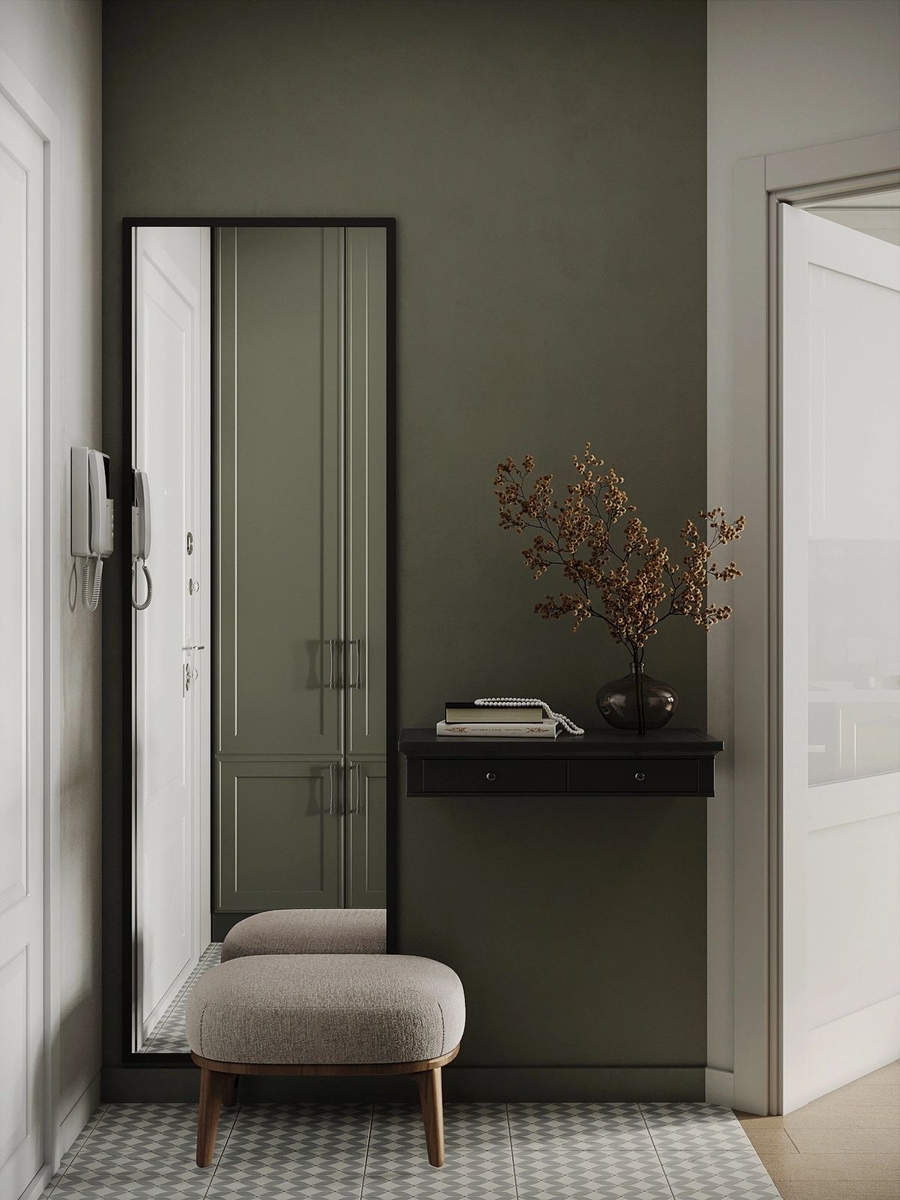 В маленькой прихожей нет места для декора. Всё, что есть, должно быть функциональным. Мы добавляем только то, что работает: зеркало (функция + визуальное расширение), крючки (функция + графичность), растение в кашпо (если есть свет и место), постер или картина (если есть свободная стена).