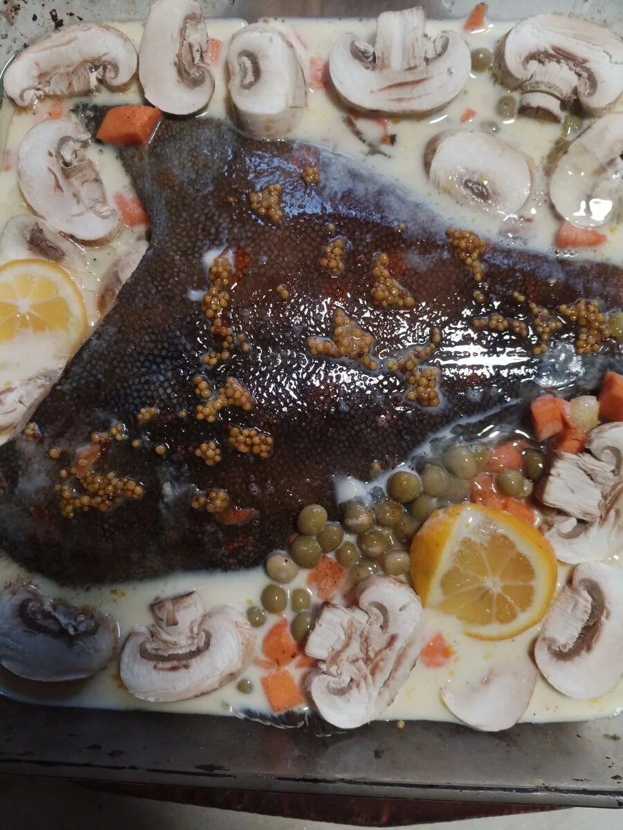 Пробовала много рецептов из камбалы. На мой взгляд, этот вариант самый лучший. Он понравиться даже людям, которые не любят рыбу. Размер камбалы подбирайте по своей форме для запекания в духовке. Можно взять крупную рыбу или несколько маленьких. Если вы хотите приготовить с гарниром можно потереть свежий картофель на крупной тёрке или порезанный мелкими кубиками . Подойдут кабачки порезанные полукольцами разложите по углам от рыбы. Ингредиенты. Камбала (помыть) Лимон у меня абхазский у него корочка сильно не горчит. Если корка у лимона горчит очистить .Нарезка кольцами. Чищеная картошка 2 шт. натрите на крупной терке (отожмите сок) или порежьте мелкими кубиками. Зеленый горошек, консервированный 1-2 ст. л. Шампиньоны свежие порезать пластинками. Консервированные шампиньоны то же подойдут. Морковь 1 шт. очистить и порезать кубиками. 2 яйца сырых. 200 гр. молока или сливок (по вкусу). Можно использовать и сметану (развести немного водой) Специи: смесь пять перцев или чёрный перец, прованс