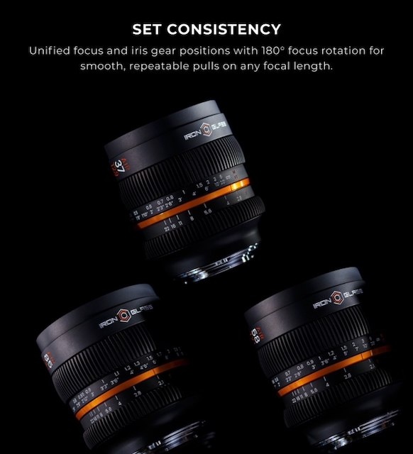 Новая серия рехаусов Air. Называют самым первым рехаусом в компактном форм факторе. Как и MK2, это полноценный кинорехаус старых фотообъективов. С совершенно новым корпусом, большим ходом кольца фокуса и, кстати, новомодными округлыми зубчиками, новой диафрагмой с 15-тью лепестками. Основное же отличие от привычных IronGlass'овских, и не только, рехаусов - они изначально рассчитаны на байонеты с коротким задним рабочим отрезком. Т.е. они для E, L, RF, Z, L, M и GF. Соответственно, компактнее и легче, чем PL и EF версии. Вроде как, хвостовики даже будут самостоятельно заменяемыми. Показаны три объектива - 37mm T2.9, 58mm T2.1 и 85mm T2.1. Покрывают больше, чем FF, как понятно из наличия байонета GF. Какие доноры используются, не говорят. Но, осмелюсь предположить, что это привычные уже МИР-1, Гелиос-44 и Юпитер-9. Правда, с 85мм есть небольшая "непонятка". С одной стороны, на фото объективов у 85мм видна только светосила T2.1. Но один очень крупный ресурс указывает, что 85мм будет вовсе