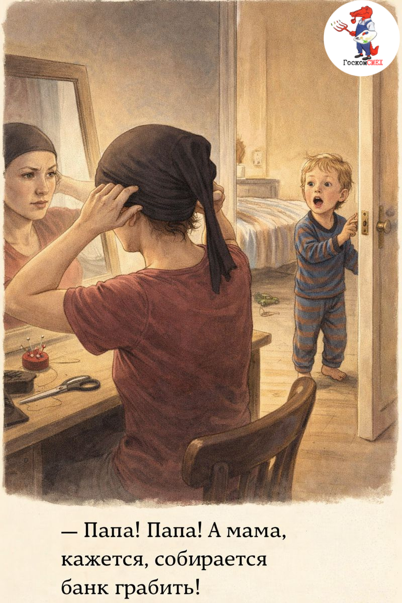 Было время я играла в молодёжном театре, и перед спектаклями приходилось решать массу мелких, но жизненно важных задач. Одна из них — как спрятать собственные волосы под парик, чтобы ни один упрямый локон не выбивался наружу. Лучшим решением оказалась самодельная «шапочка» из чулка, аккуратно подогнанная под цвет парика. И вот сижу я у себя в комнате: на столе нитки и ножницы, в руках — чёрный чулок. Надеваю его на голову, чтобы отмерить нужную длину, внимательно разглядываю отражение в зеркале и прикидываю, где и как лучше прошить. В этот самый момент дверь тихо открывается, и на пороге появляется моё пятилетнее чадо. Он замирает, не произнося ни слова. Мы молча смотрим друг на друга. Его взгляд медленно скользит по моей голове и останавливается на чулке, свисающем с макушки. Не проронив ни звука, ребёнок так же медленно разворачивается, осторожно выходит из комнаты и аккуратно закрывает дверь. И уже через секунду из коридора раздаётся отчаянный вопль: — Папа! Папа! А мама, кажется,