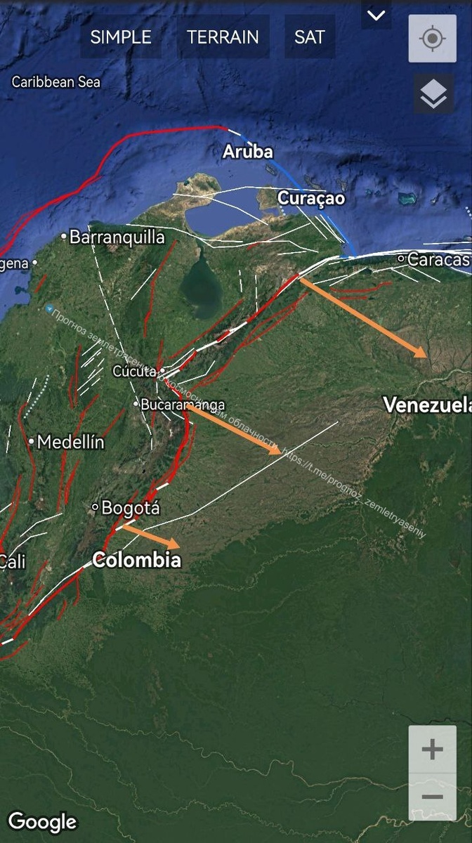 Над Венесуэлой и Колумбией в облаках сформировалась проекция от границы Североандской плиты.