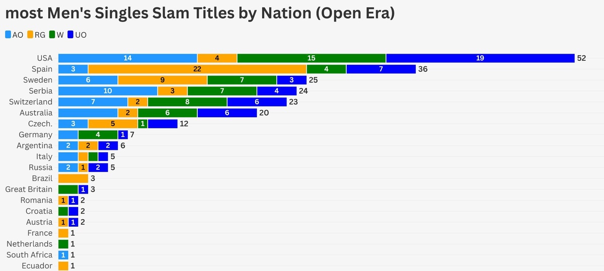 🎾 Самое большое количество титулов Большого шлема в мужском одиночном разряде по странам (Открытая эра): 🥇 США 🥈 Испания 🥉 Швеция Сербия Швейцария Австралия Чехия Германия Аргентина Италия Россия Бразилия Великобритания Румыния Хорватия Австрия Франция Нидерланды ЮАР Эквадор Подпишись на Эйс и точка