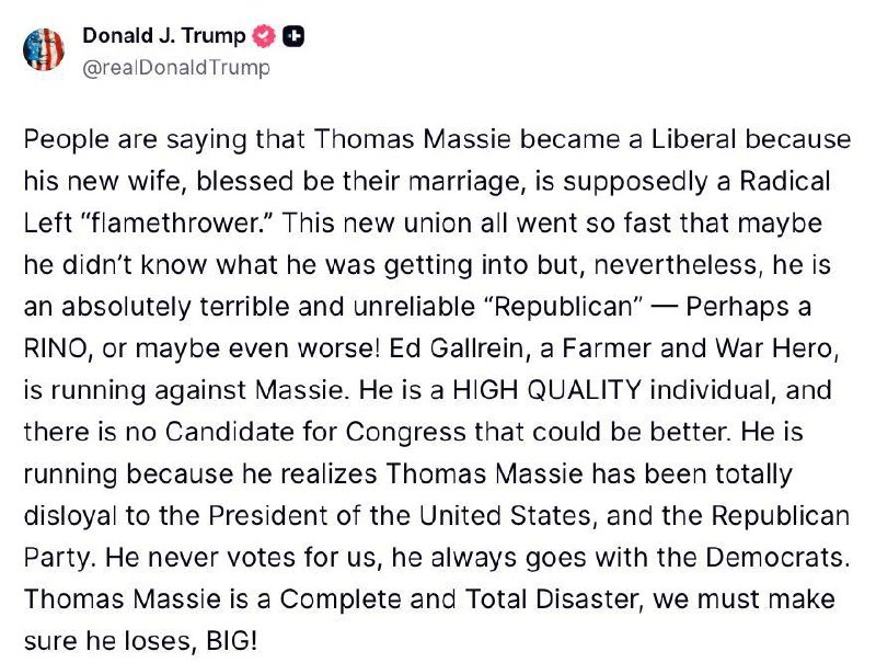 Trump goes personal and attacks Thomas Massie’s WIFE