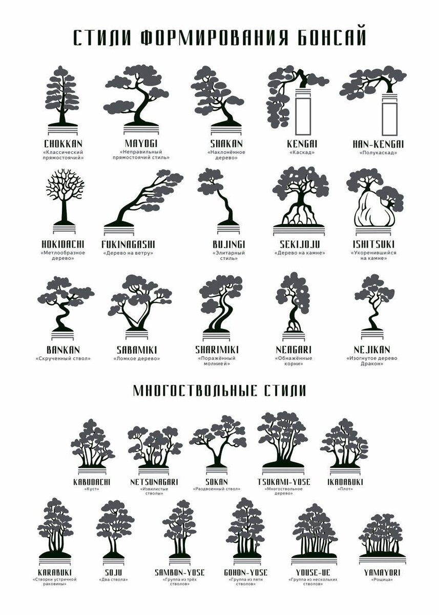 Развивающееся в течение столетий искусство бонсай приобрело стили и направления, подсказанные самой природой. Классифицируются бонсай из определенных особенностей каждого экземпляра и напрямую зависят от того, как он выращивался. С возрастом они становятся все более красивыми и могучими. Во-первых, бонсай классифицируются по высоте экземпляра. Также существует их классификация по виду корневой системы: растет ли один или несколько бонсай из одного корня или же из нескольких корней. Большинство приемов формирования бонсай основываются на их стилевых различиях.