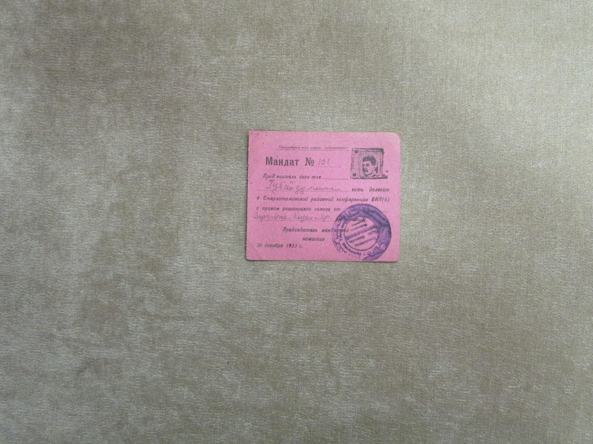 — Мандат № 101 Губайдуллина Мурсалима Дажбулатовича (1890-1946 гг.), делегата 4 Стерлитамакской районной конференции ВКП(б) от Зирганской МТС Кызыл-Яр. БАССР. 30 декабря 1933 года. Период создания: 30 декабря 1933 года. Материал, техника: бумага плотная печать типографская тушь печать круглая Размер: 10,3х8,8 см Место создания: БАССР. Номер в Госкаталоге: 57254959 Номер по КП (ГИК): СИКМ ОФ 2771/9 Инвентарный номер: — Внешняя ссылка: — Местонахождение Муниципальное автономное учреждение культуры "Стерлитамакский историко-краеведческий музей" городского округа город Стерлитамак Республики Башкортостан Предмет из комплекса документов Губайдуллина Мурсалима Дажбулатовича (1890-1946 гг.), участника гражданской войны, рейда Блюхера.