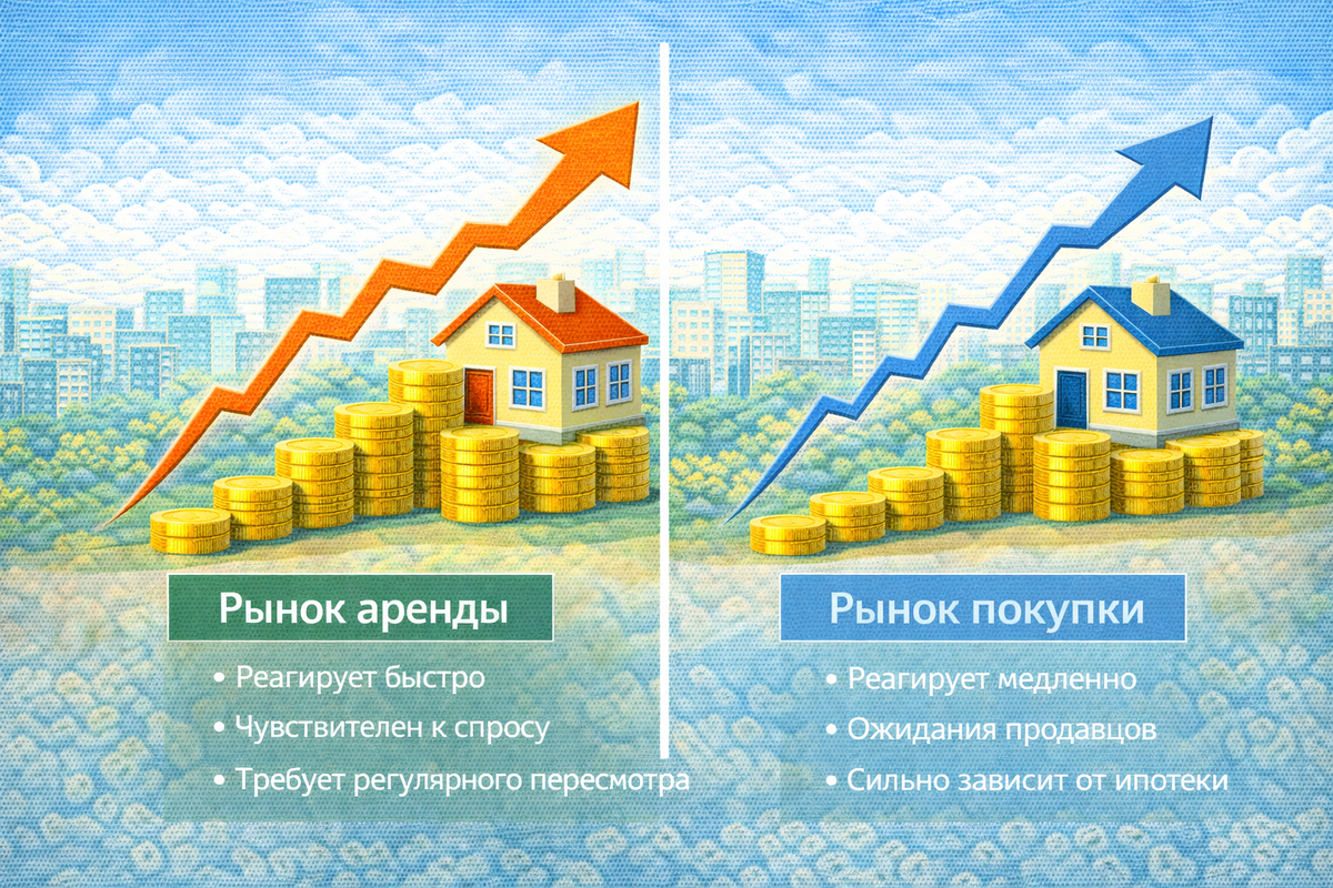 Зато арендный рынок реагирует первым. Именно в аренде видно, где жильё реально нужно людям, а где спрос начинает ослабевать. В 2026 году эта разница стала особенно заметной: в ряде регионов арендные ставки росли или стабилизировались, тогда как цены покупки перестали двигаться. Это не парадокс — это нормальная логика рынка. Рынок покупки жилья медленный по своей природе. На него влияют: Даже если спрос снижается, продавцы ещё долго держат цену, надеясь на «возврат рынка». В результате ценник в объявлениях может не меняться месяцами, хотя реальных сделок становится меньше. 📌 Интересно знать: