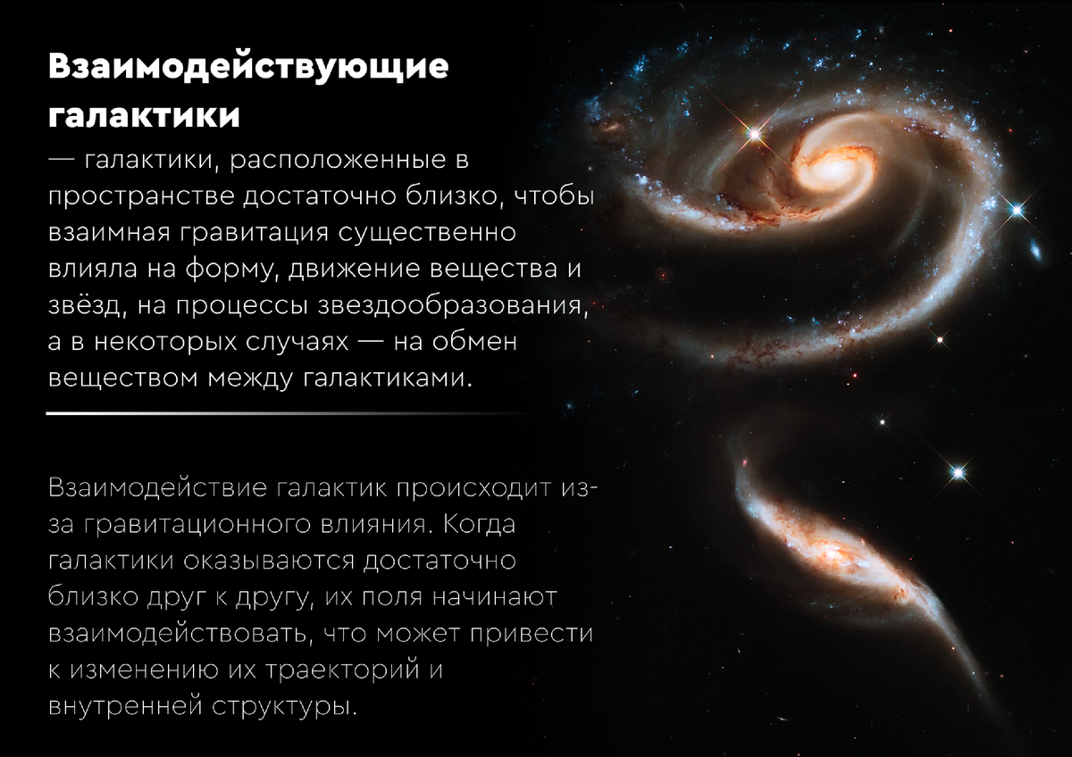 Вообразим, что мы — астрономы середины XX века. Новые мощные телескопы открывают нам десятки тысяч далёких «звёздных островов». Большинство из них ведут себя прилично: спирали аккуратно закручены, эллипсы симметричны. Но вот ваше внимание приковывает странная компания. Вы замечаете что около 5-10% галактик выглядят так, будто попали в космический шторм. Они искорёжены, асимметричны, будто помяты неведомой силой. Некоторые пары окружены общим сияющим ореолом или связаны призрачными звёздными мостами. А иные простирают в пустоту фантастические хвосты, длиной в сотни тысяч световых лет, словно кометы невероятного масштаба.