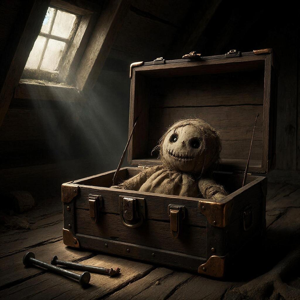 Разбудив Андрея, мы взяли фонари и поднялись по шаткой лестнице. Ларц был на месте. Крышка была приоткрыта. Я направил луч внутрь. Кукла лежала в той же позе, но ее тряпичная голова была теперь повернута к нам. Вышитый красный рот-крестик казался кривой, зловещей ухмылкой. А три ржавых гвоздя, аккуратно завернутые в тряпицу, теперь лежали поверх куклы, образуя правильный треугольник.