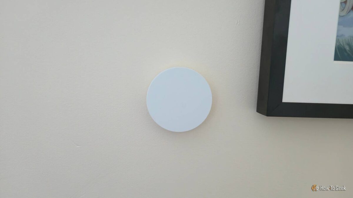 А вот IKEA TIMMERFLOTTE даже скрывать не хочется. Это аккуратный белый круг — и только если нажать на его лицевую часть, на экране мелькнут температура и влажность. Благодаря стильному дизайну я без колебаний повесил его прямо между картинами над рабочим столом! Этот неприметный гаджет даже стал героем моего обзора умной фоторамки SwitchBot AI Art Frame.
