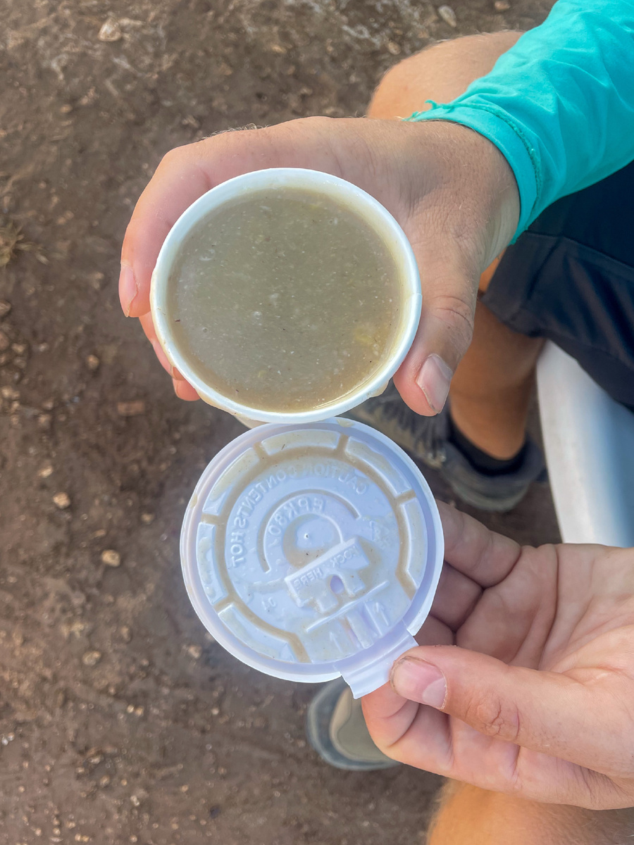 Как только вышли, Макс сразу вдоль дороги купил кашу (любит человек всё пробовать). Кажется, здесь на Ямайке вообще только два вида стрит-фуда: по утрам везде продают кашу, а после обеда - острую курицу. Всё. Каша была, кстати, вкусная, но мы не поняли, из чего (потом загуглила - вроде кукурузная)😁 Она у них очень жидкая, так что её можно пить, как супчик, и с большим количеством специй, особенно корицы. Ну, и сладенькая.