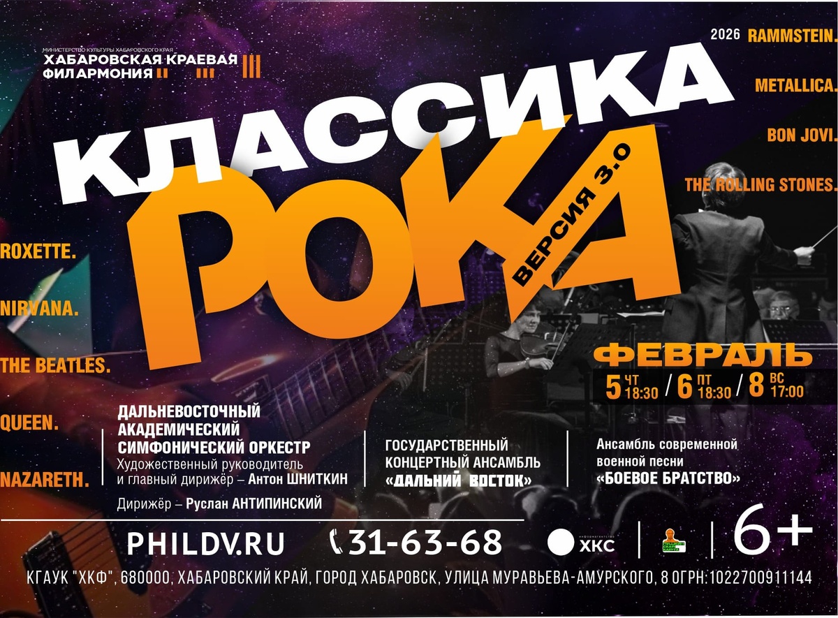 версия 3.0» ✔ симфоническое прочтение мировых рок-хитов ✔ дальневосточный академический симфонический оркестр ✔ участие вокальных и инструментальных ансамблей ✔ программа из культовых композиций xx–xxi века ✔ большой зал 📅 Когда: #5_февраля, #6_февраля, #8_февраля 18:30 ⛳ Где: Большой зал филармонии 💳 Стоимость: 1200–2800 ₽ Билеты 👉 Афиша Хабаровска. Куда сходить, экскурсии