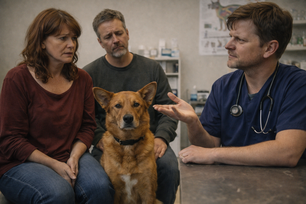 Женщина — Оля — бодрая, собранная, лицо “я держу себя в руках”. Мужчина — Игорь — напряжённый, с видом “я вообще не виноват, но сейчас меня назначат виноватым”. И пёс — рыжий, крепкий, с интеллигентной мордой и глазами человека, который уже всё понял про эту семью, но из уважения молчит.