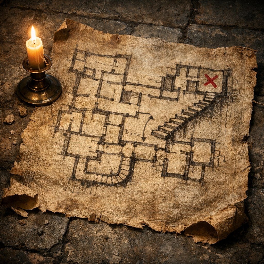 «От нашей башни - вниз, мимо старой сушильни для трав,- шептал он, тыча грязным пальцем в схему. -Там коридор старый, по нему редко кто ходит. Он выходит в служебный коридор у восточного крыла.».