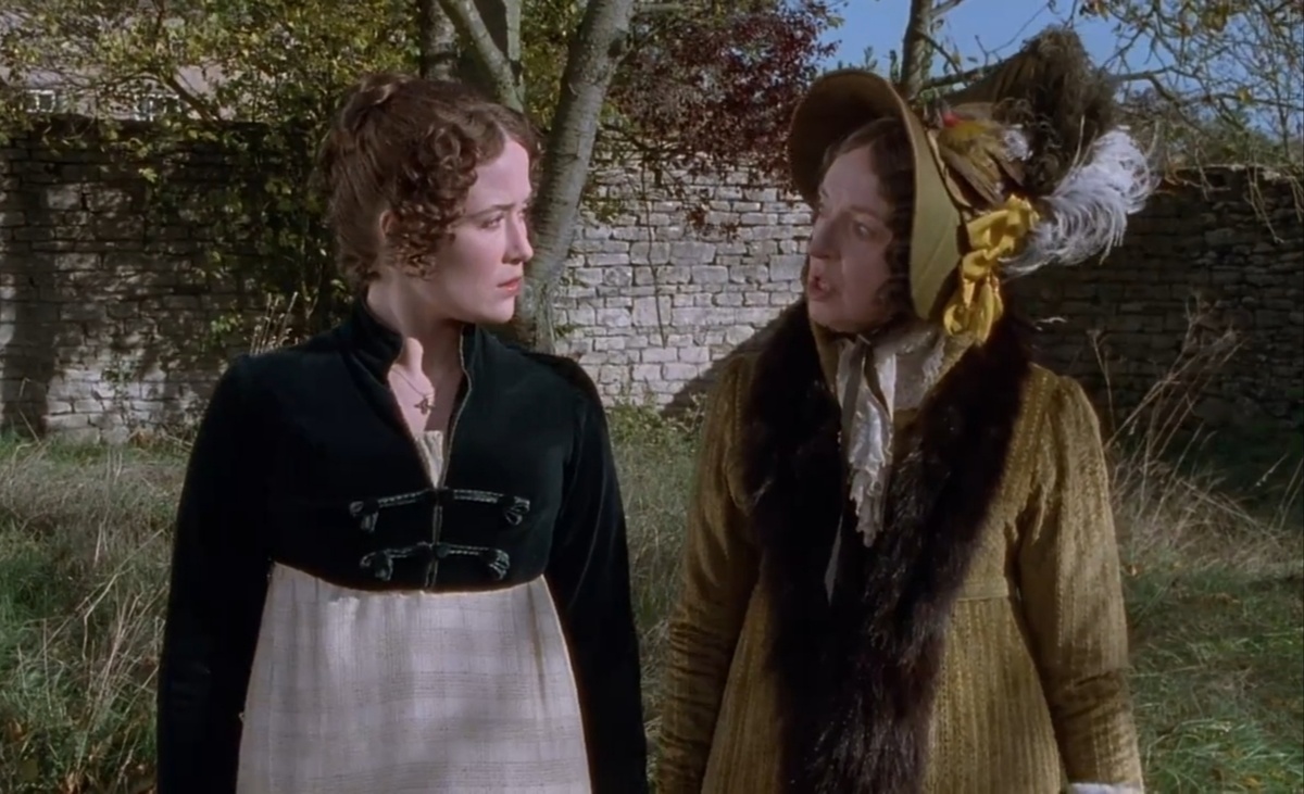 Здесь тоже сходство капоров с высокой тульей на богатенькой леди и на простолюдинке. Но, конечно, не случайное, как в "Гордости и предубеждении" 1995 года (точнее, оно случайное только для героев; сходство запланировано ехидными постановщиками).