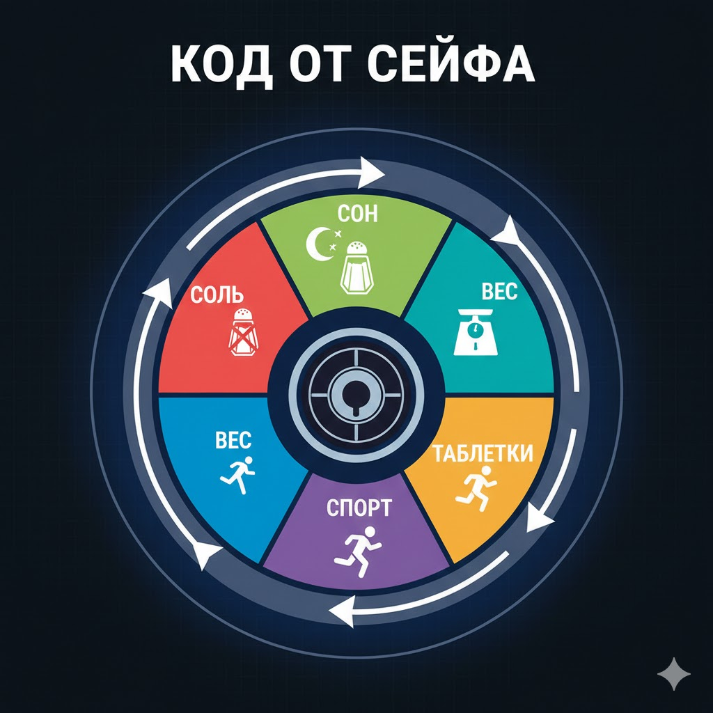 Автор предлагает представить борьбу с давлением как код от сейфа из пяти шагов, где каждый открывает следующий уровень защиты сосудов. Структура кода: Главная фатальная ошибка: напуганный человек сразу надевает кроссовки и бежит «убегать от инфаркта» при давлении 160 и выше.