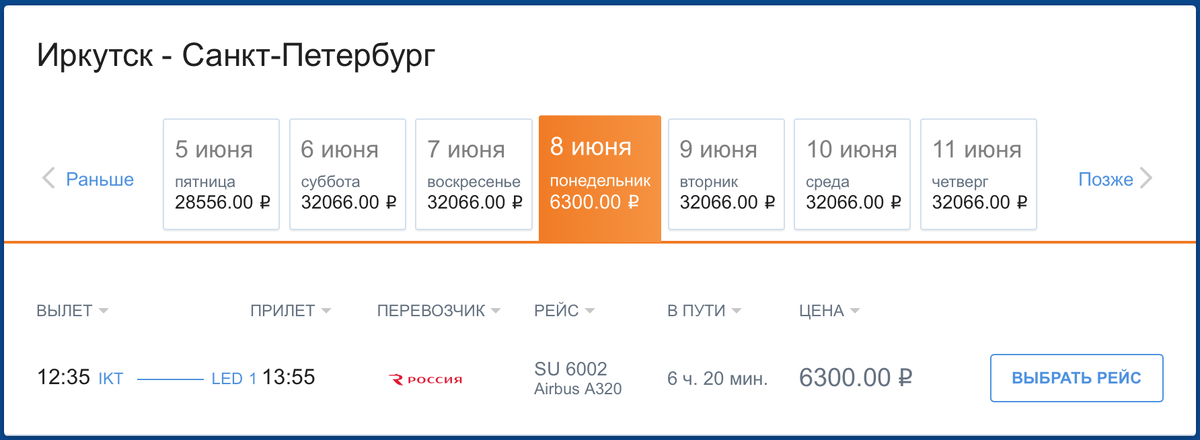 - Иркутск – Санкт-Петербург: взрослый - 6 300 рублей, детский - 4 725 рублей
