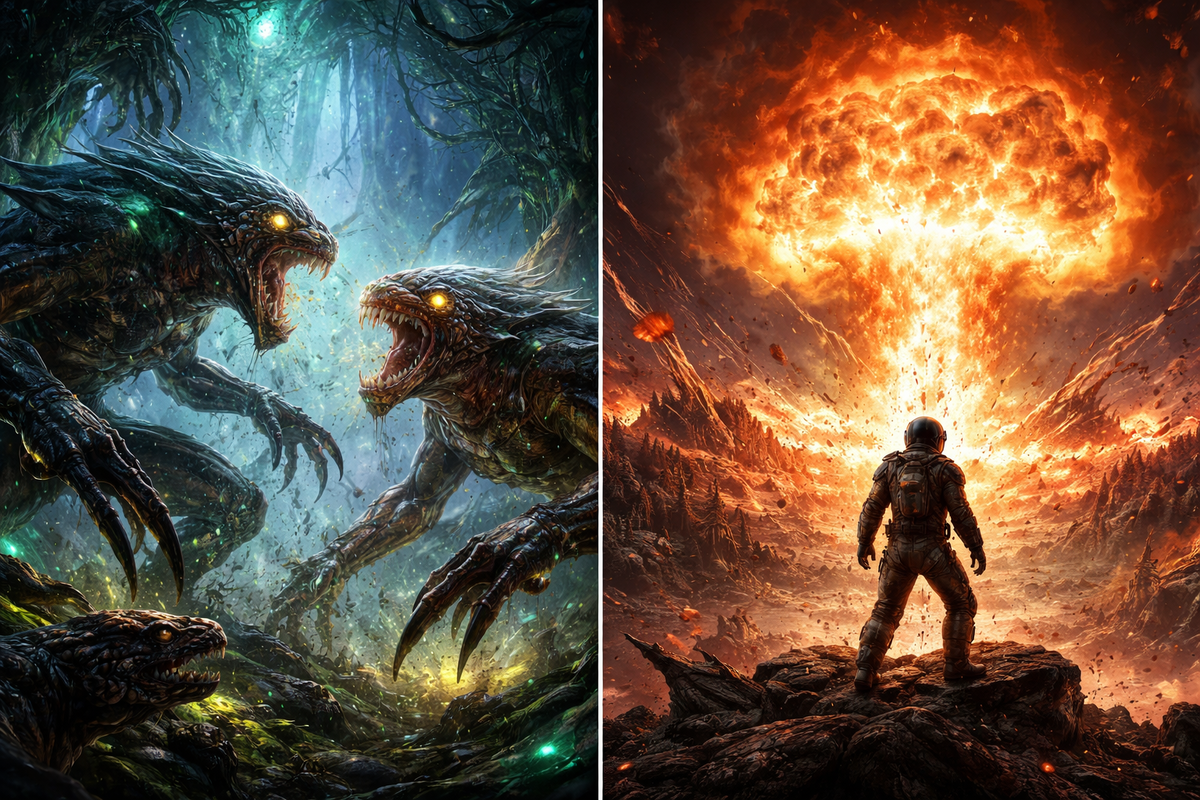 Он наблюдал сцену: две огромные твари с когтями длиной почти с руку столкнулись за территорию. Их полупрозрачные тела переливались зелёными, красными и синими оттенками. Лазероподобное свечение глаз, крики, удары лапами — лес дрожал от их гнева.