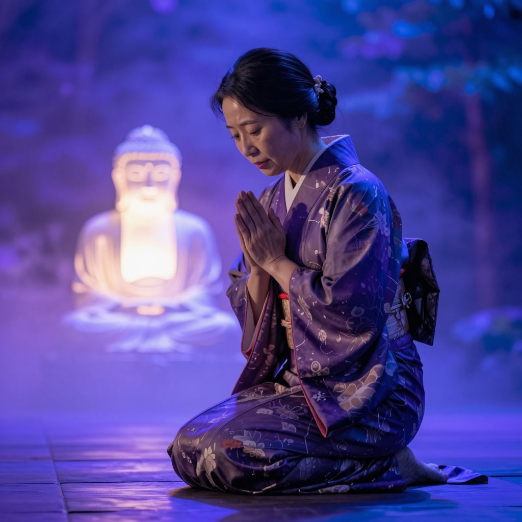 Будда не говорит громко — его голос звучит *внутри* её сознания, как эхо давно забытых молитв: