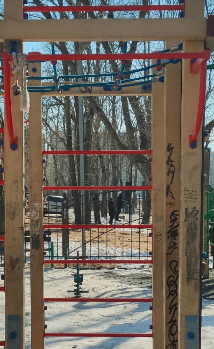 Приехали что-то делать с камерами. Как раз с той, в которую вчера кидали. У одного мужчины куртка "подряд".