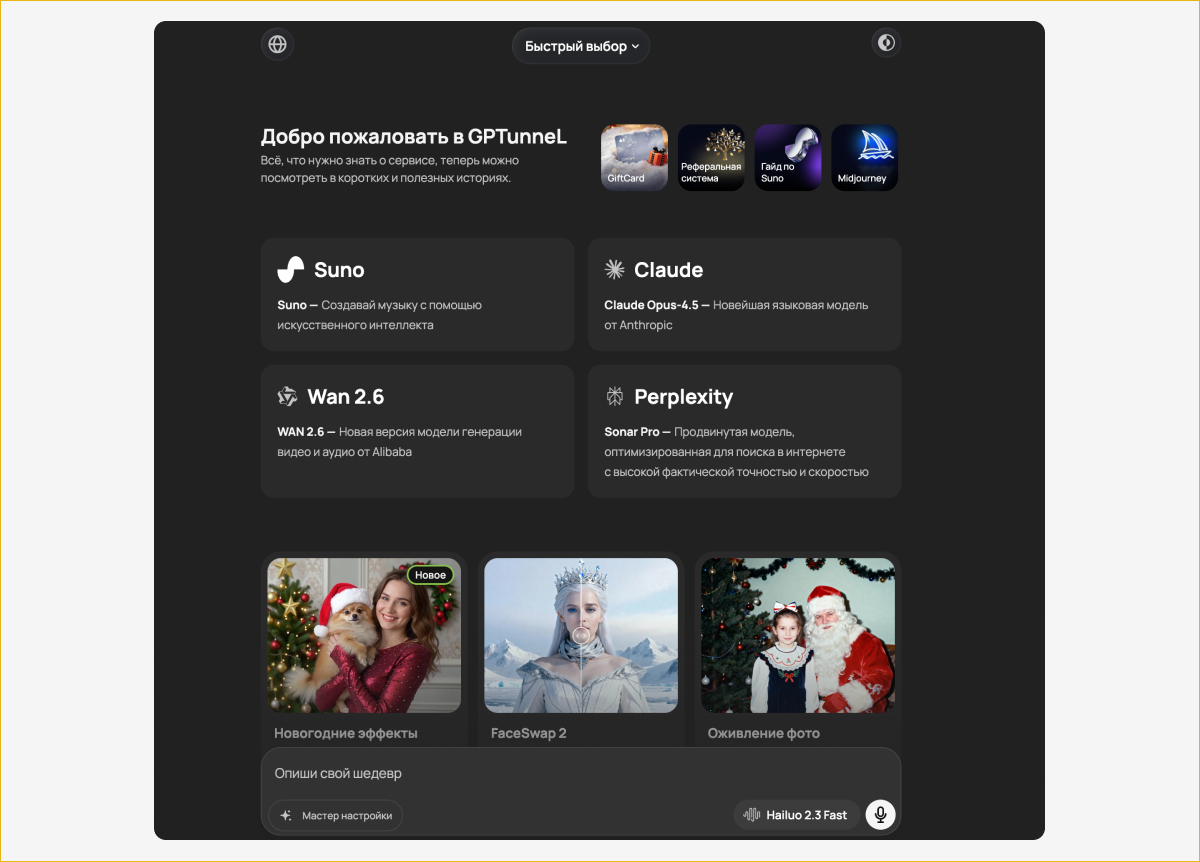 Это платформа, которая дает доступ к популярным зарубежным нейросетям из одного личного кабинета. Сервис удобен для пользователей из России, потому что не требует обхода блокировок и решает проблему с оплатой подписок напрямую зарубежным платформам.