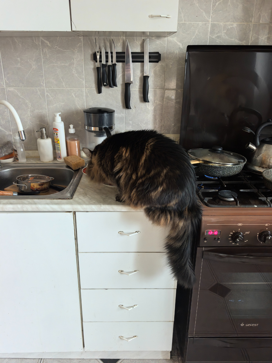 Спал я, спал, а потом пришёл на кухню выпросить вкусность. Ну и хозяйка решила мне креветок сварить. Вот только чистила она их долго. Я сначала кричал, требовал, ну а потом просто запрыгнул на стол и начал есть:
