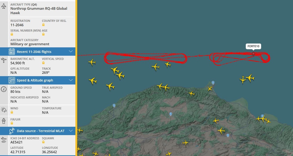 Американский БПЛА-разведчик летает над Чёрным морем возле Турции, следует из данных веб-сервисов