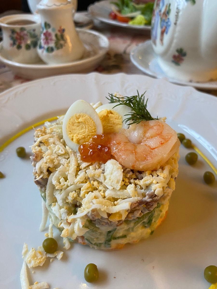 Неплохой оливье, поданный нарядно — с креветкой и красной икрой.