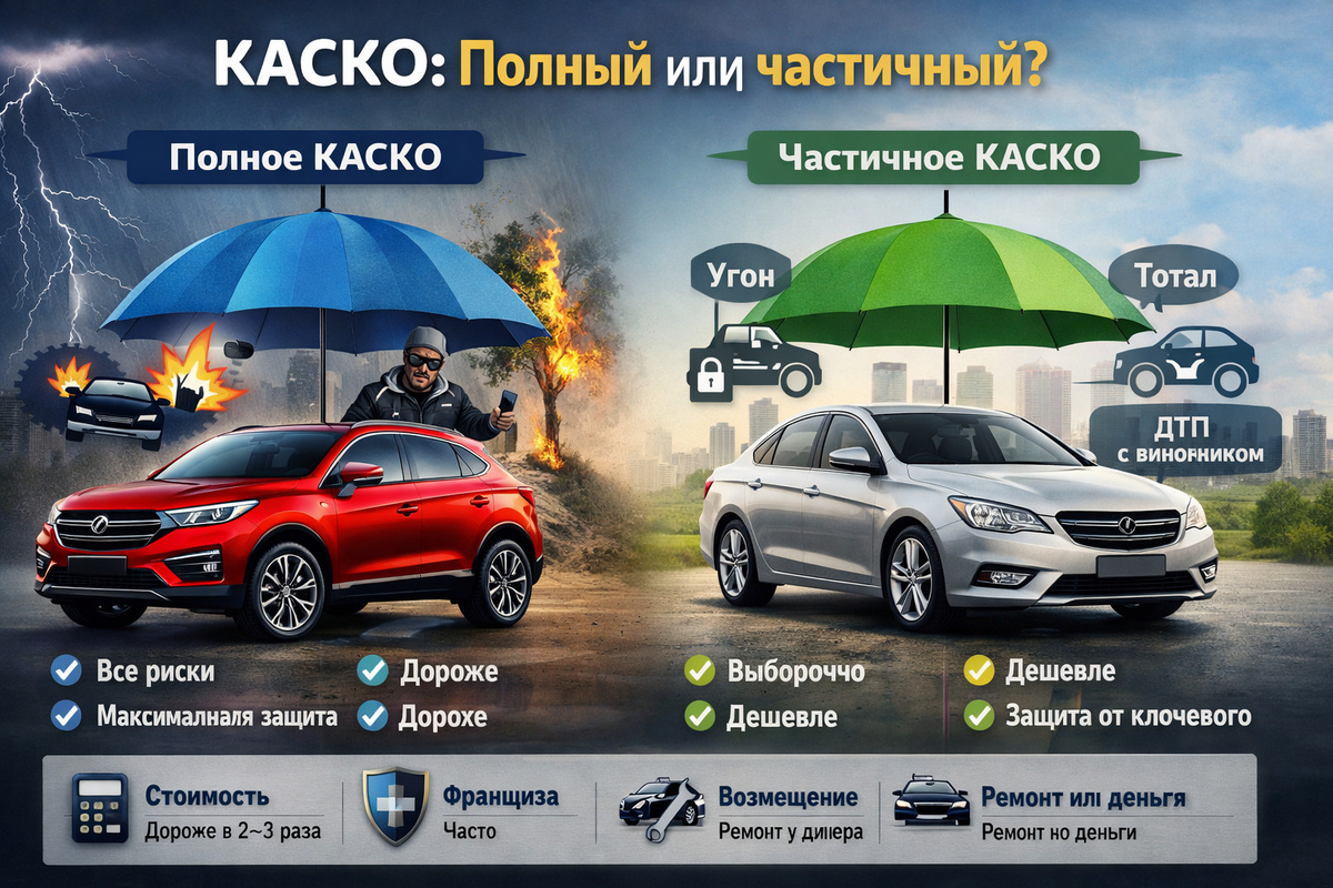 🧭 Главная мысль: полное КАСКО — для тех, кто хочет максимального спокойствия; частичное — для тех, кто готов взять на себя мелкие расходы ради экономии, но хочет защититься от крупных потерь.