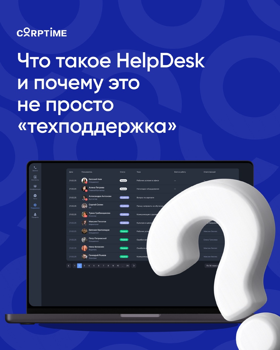 » HelpDesk часто представляют как место, куда пишут, когда «что-то сломалось». На практике — это единая точка входа для любых рабочих запросов, не только технических. Простой пример из жизни команды: — нужен отпуск — не работает принтер — доступ к сервису не выдали — сломался ноутбук — вопрос по онбордингу — справка для бухгалтерии Если всё это летит в личные чаты или общий канал, происходит одно и то же: запросы теряются, дублируются, отвечают не те и не вовремя. HelpDesk решает другую задачу: он собирает все запросы в одном месте и сразу фиксирует: — суть запроса; — кто отвечает; — текущий статус; — историю общения. Поэтому корректнее думать о HelpDesk не как о «техподдержке», а как о службе заботы о команде — для HR, IT, офиса и руководителей. В CORPTIME HelpDesk — это часть платформы: запросы не живут отдельно от чатов, задач и структуры компании. Это снижает хаос и убирает лишние уточнения «а ты видел мой вопрос?».
