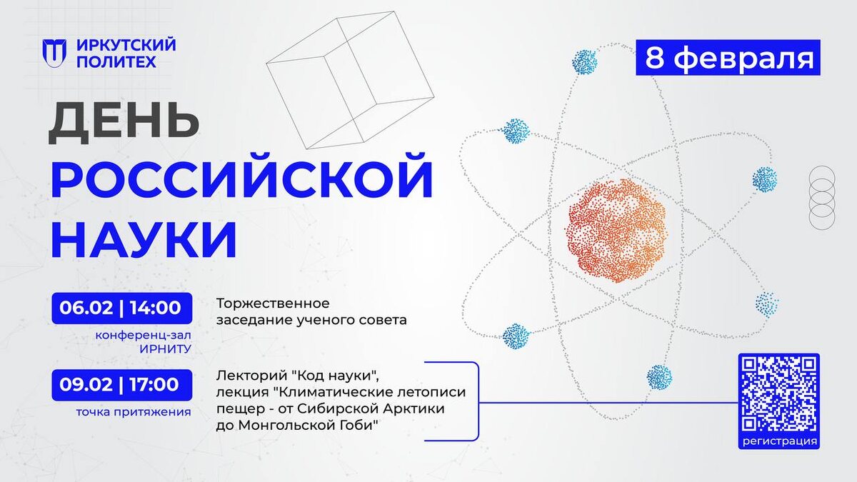 ! 🔬 С 6 по 9 февраля Иркутский Политех празднует День российской науки. Приглашаем студентов, сотрудников и всех, кто интересуется наукой, присоединиться к двум знаковым событиям! 🗓️ 6 февраля | 14:00 | Г-конференц-зал Расширенное заседание Учёного совета Проректор по научной работе Александр Кононов представит доклад о ключевых научных достижениях ИРНИТУ в 2025 году — от прорывных исследований до успешных проектов с индустриальными партнёрами. ✨ В программе — торжественная церемония награждения учёных, чей труд укрепил научный авторитет университета и внес значительный вклад в развитие науки и образования. 🗓️ 9 февраля | 17:00 | «Точка притяжения» (зал библиотеки) Лекция в рамках лектория «Код науки» «Климатические летописи пещер — от Сибирской Арктики до Монгольской Гоби». Что могут рассказать пещеры о прошлом климата Земли? Почему изучение древних отложений помогает прогнозировать будущее? И как это связано с современными вызовами — от экономики до технологий? Об этом — в увле