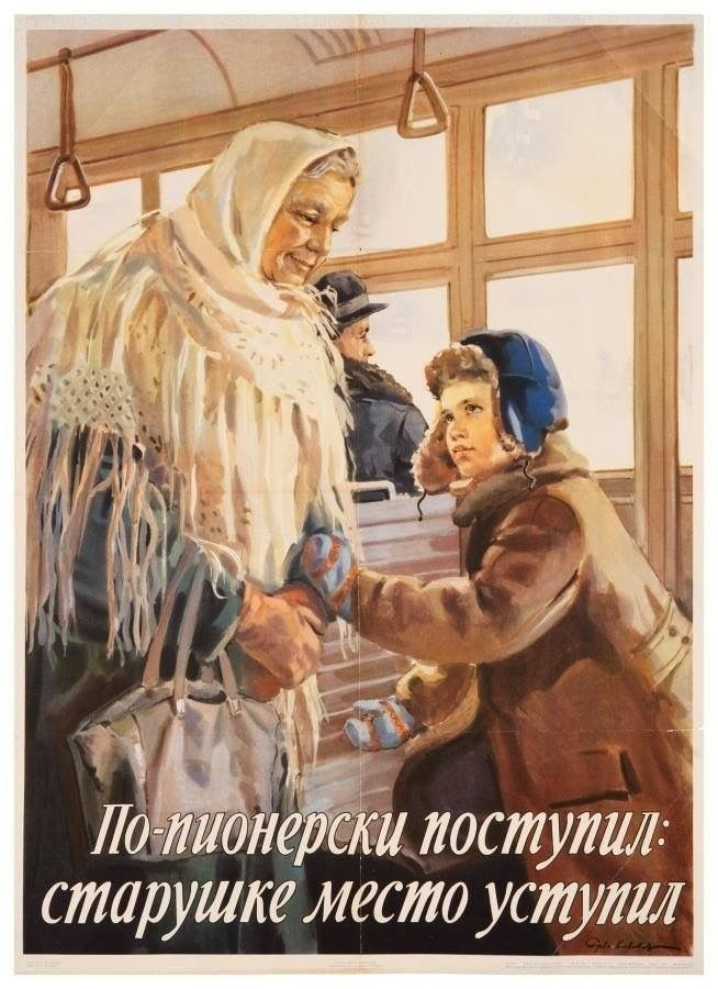 Всем добрый день! Вот нашла эту старую советскую рекламу к заглавному фото к этому посту. Она с главным-героем-мальчиком-младшим пионером и бабушкой прямо-таки всех нас призывала тогда, в СОЮЗЕ еще, уважать старших, женщин с маленькими детьми, инвалидов и пенсионеров в транспорте. И в метро тогда были объявления , чтобы места уступали людям пожилого возраста и инвалидам, и в автобусах, троллейбусах по всем городам и весям Союза, и даже места эти в различном транспорте были тогда подписаны: места для особых категорий граждан. Не прошло и 35 лет после развала Союза и как же всё поменялось! Все места абсолютно, когда входишь в транспорт, начиная с первых, заняты молодежью в наушниках, с глазами, опущенными в телефон и "иными" (чаще всего). У нас-то в городе Барнауле места в наших теснейших, не приспособленных для нас, рослых и одетых по-зимнему сибиряков, часто заняты еще и огромной армией гастарбайтеров, иногда сидящих и громко разговаривающих по телефону на всю аудиторию автобуса или