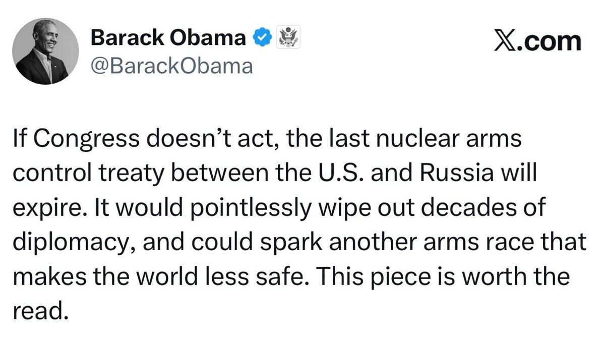 Барак Обама – о том, что истечение срока ДСНВ принесет миру непоправимые последствия: «Если конгресс не примет мер, последний договор о контроле вооружений между США и Россией прекратит свое существование. Это бессмысленно сотрёт десятки лет дипломатии и рискует положить начало новой гонке вооружений, что сделает мир менее безопасным». 🌐 За Русский Мир©Резервный📣Наш Чат✔️Подпишись‼️