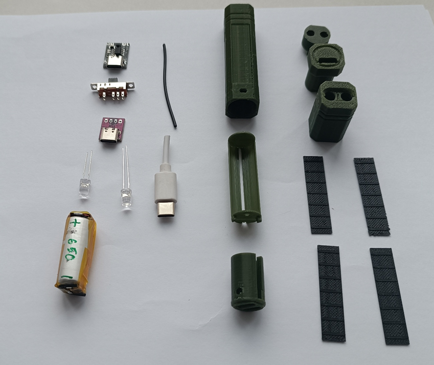 Всем привет! Сегодня сделаем EDC фонарик с функцией аварийного Power Bank. Что нам понадобится: - литий-полимерный аккумулятор на 650 мАч (взял со старой электронки, размеры ⌀12,5х39мм); - зарядный модуль для аккумуляторов (https://ali.click/73u2ys); - переключатель на 3 позиции (https://ali.click/12t2y5); - плата Type C (https://ali.click/s3t2yv); - светодиод белый 5 мм (https://ali.click/d4t2yh); - светодиод УФ 5 мм (https://ali.click/y4t2ys); - шнур уплотнительный 1,5 мм (https://ali.click/e6t2yi); - часть зарядного провода с Type C; - детали корпуса, напечатанные на 3D-принтере (скачать можно здесь: https://www.thingiverse.com/thing:7287305) Итак, начнем. Установим светодиоды в держатель. Припаяем выводы «-» двух диодов к черному проводу. Припаяем выводы «+» диодов к отдельным красным проводам. Заполним обратную сторону термоклеем. Припаяем светодиоды к плате Type C и переключателю. Важно учитывать длину провода к выводам переключателя, так как от этого зависит какой светодиод вы х