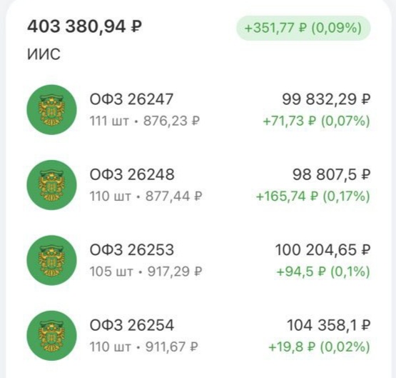 В общем краткая предыстория. Решили мы с женой пристроить часть наших накоплений из фонда ликвидности в новое место. Сейчас уже в фондах ликвидности держать деньги не совсем выгодно становится, потому что ключевую ставку постепенно снижают и вот именно в данный момент времени мы получаем "окно возможностей" в ОФЗ, потому что можно поймать купонную доходность, близкую к среднегодовой доходности акций на долгосрочном горизонте. Напомню, доходность рынка акций равна ≈ 15% годовых. Теперь к самому интересному, куда вложили 400 000₽. Мы пополнили ИИС на эти деньги, он у нас 3 типа, а значит в конце года получим вычет в размере 52 000₽ и не будем платить налог с купонов. Далее на ИИС купили 4 выпуска ОФЗ, а конкретно: 26254, 26253, 26248 и 26247. На момент покупки это были самые высокодоходные выпуски. Мы зафиксировали купонную доходность в размере 14,08%, а доходность к погашению вообще 15%, это значит, что если мы будем держать эти выпуски до погашения, то среднегодовая доходность будет