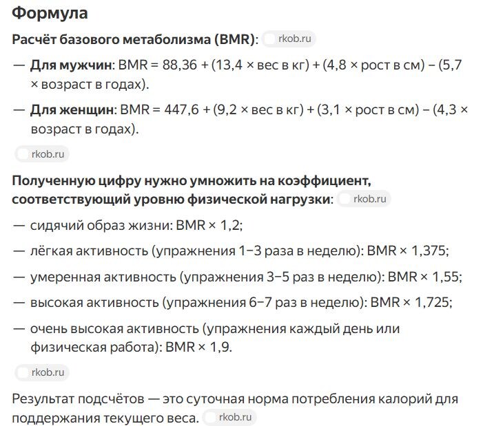Перелом сознания произошел после того, как Дзен свёл меня с миниатюрной женщиной 44 лет, рост которой 165 см, а вес 44 кг. Это событие случилось меньше месяца назад. Она уверенно сказала о том, что ей нужно питаться не больше чем на 1500 калорий, чтобы не поправляться. Я закатила глаза, как обычно, и пошла считать ее реальную потребность в калориях по формуле Харриса-Бенедикта.