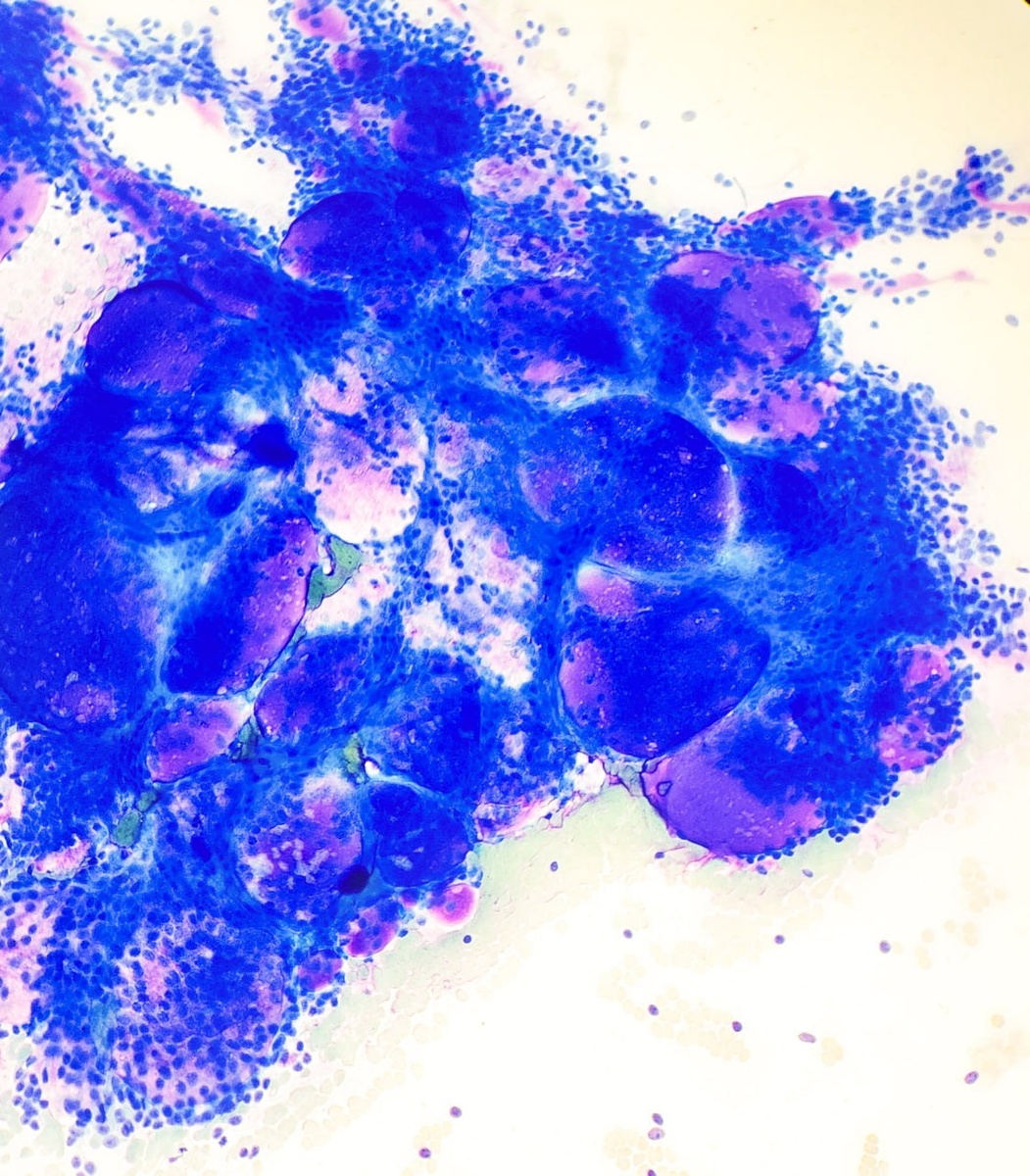 И АКК, и плеоморфная аденома относятся к базалоидным опухолям с матриксом, однако ключевой диагностический признак, позволяющий предпочесть диагноз АКК, — базалоидные клетки, окружающие глобулы матрикса. #легкое #цитология
