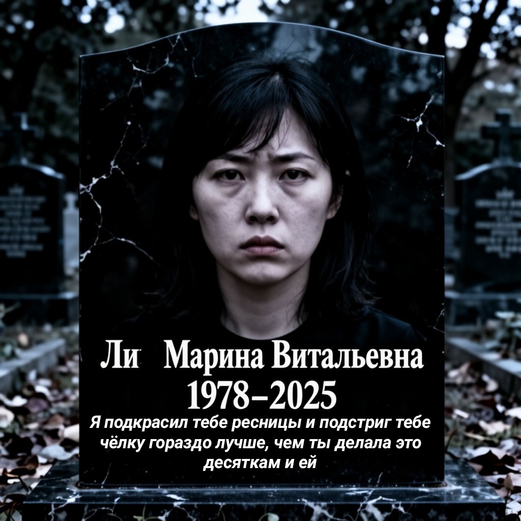 Надгробие из чёрного гранита. Фотопортрет: женщина с азиатскими чертами, тяжёлый, пронзительный взгляд, будто смотрит не в камеру, а *сквозь* неё.