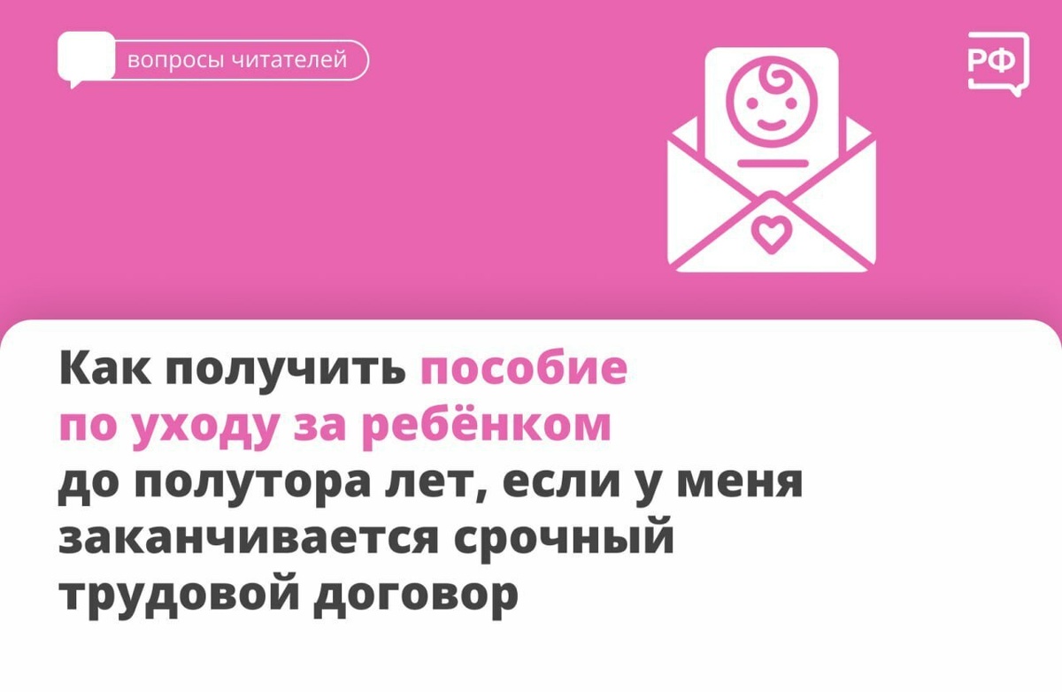 родам. Об этом говорится в ст. 261 ТК РФ. Для этого вам нужно написать заявление в отделе кадров и приложить справку о беременности — её следует обновлять раз в три месяца и предоставлять по месту работы. ➡️После истечения срочного трудового договора вы сможете оформить пособие по уходу за ребёнком до полутора лет. Так вы будете ежемесячно получать 40% от вашего среднего заработка за последние два года. Оформить выплату можно через соцзащиту по месту жительства, МФЦ или онлайн через Госуслуги. Вам понадобится: — заявление о назначении ежемесячного пособия по уходу за ребёнком до полутора лет; — свидетельство о рождении ребёнка; — трудовая книжка или справка о заработной плате за последние два года; — реквизиты счёта для перечисления выплат. 📌Важно! Выплаты продолжатся, пока ребёнку не исполнится полтора года.