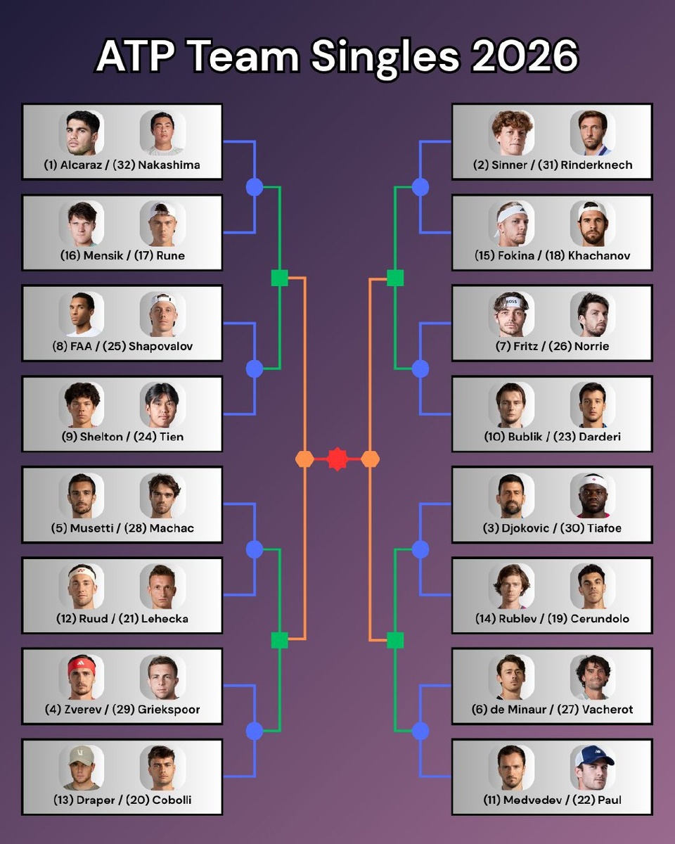 ? 🤔 Правила простые: * Обычный подсчет очков, игра до двух побед в сетах * Только один игрок от команды находится на корте * Если игрок проигрывает очко, он меняется с партнером перед следующим розыгрышем * Если игрок выигрывает очко, он играет еще одно очко * После розыгрыша второго очка, игрок должен поменяться с партнером, вне зависимости от того, выиграл он или проиграл * Команда сохраняет подачу; после смены, вышедший игрок продолжает подавать или принимать до смены подачи * Стандартные правила для "ровно", "больше", и тай-брейков Сетка ATP Team Singles 2026 выглядит так: Alcaraz / Nakashima Mensik / Rune FAA / Shapovalov Shelton / Tiafoe Musetti / Machac Ruud / Lehecka Draper / Собой Sinner / Rinderknech Fokina / Knachanov Fritz / Norrie Bublik / Darderi Djokovic / Tiafoe Rublev / Cerundolo de Minaur / Vacherot Medvedev / Paul По мнению автора, против Рублева и Черундоло будет очень тяжело играть 😈 Подпишись на Эйс и точка